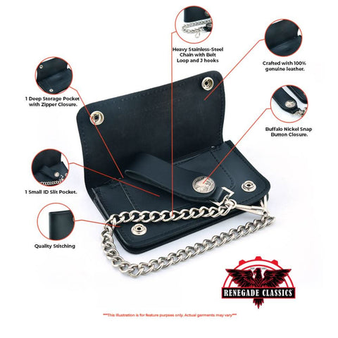 The Black Buffalo Leather Long Bi-Fold Biker Wallet blends rugged durability with a sleek design. It offers both toughness and style. Its long bi-fold design provides ample storage for cards and cash, making it perfect for bikers on the move. Built to withstand the elements, this wallet is a reliable companion for any journey on the road.