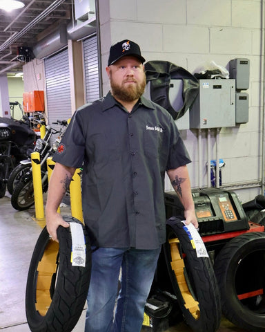 Heavy Duty Mechanic’s Shirt. Embroidered and Screen Printed.  Embroidered Chest and Sleeve, and Screen Printed Back.