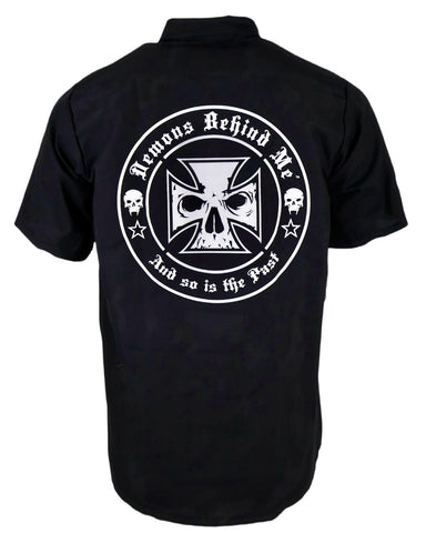 Men's Embroidered Black Shop Shirt - White Stitch Cross on Sleeve.