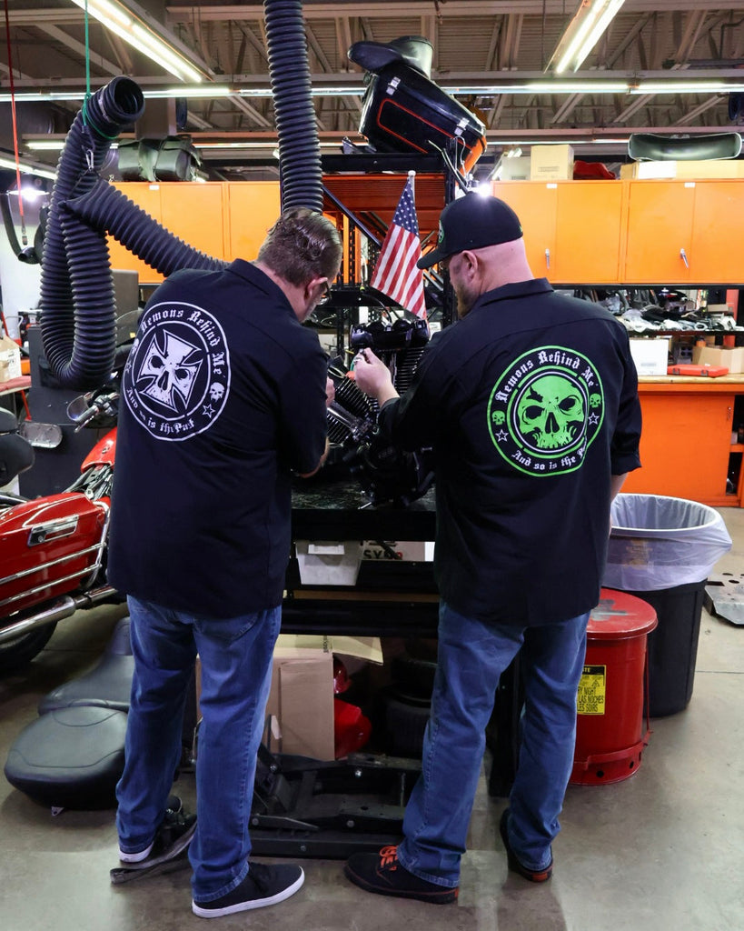 Heavy Duty Mechanic’s Shirt. Embroidered Chest and Sleeve, and Screen Printed Back.