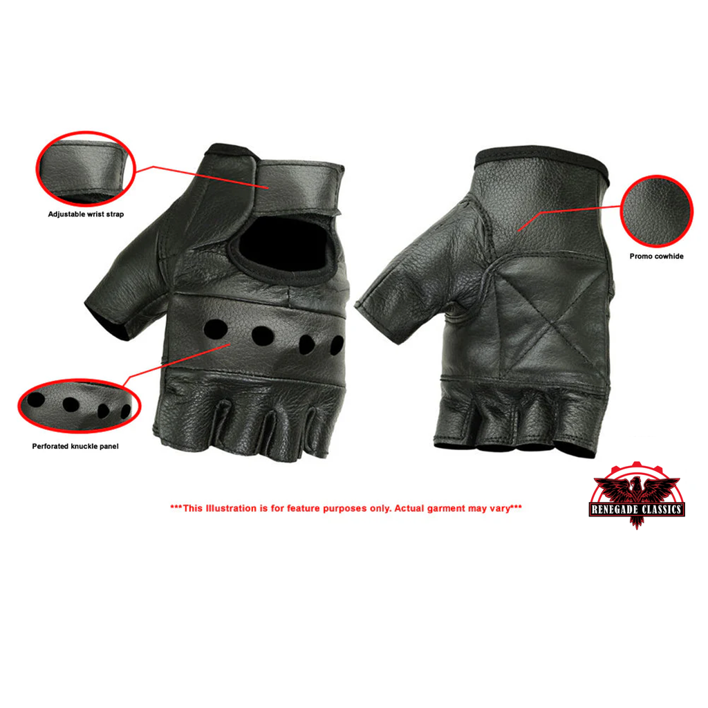 Fingerless glove made with promo cowhide featuring perforated panels and adjustable wrist strap.