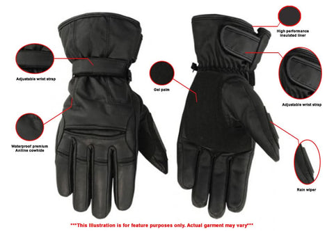 Men's waterproof glove made with premium Aniline cowhide, rain wiper on thumb, gel palm and high performance insulated liner for extra warmth.