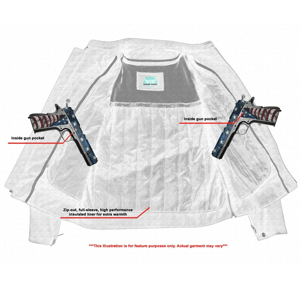 2 inside concealed gun pockets made of special heavy-duty textile with built-in holsters and snap closure.