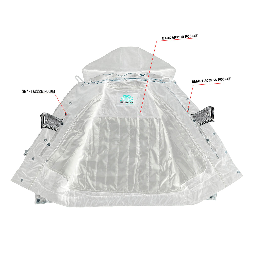 2 upgraded style concealed gun pockets between the snap and the zipper made of special heavy-duty textile with built-in holsters and snap closure.