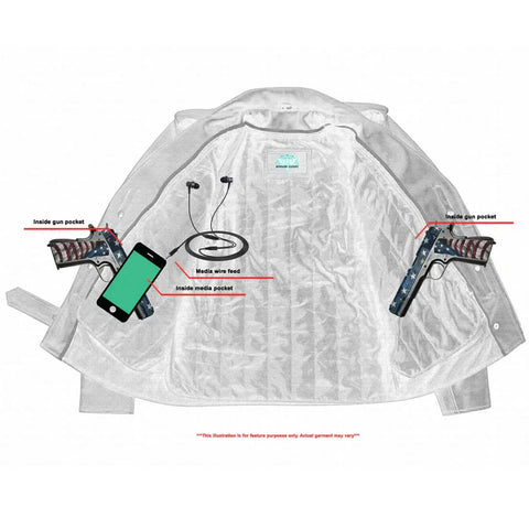 2 inside concealed gun pockets made of special heavy-duty textile with built-in holsters and snap closure.