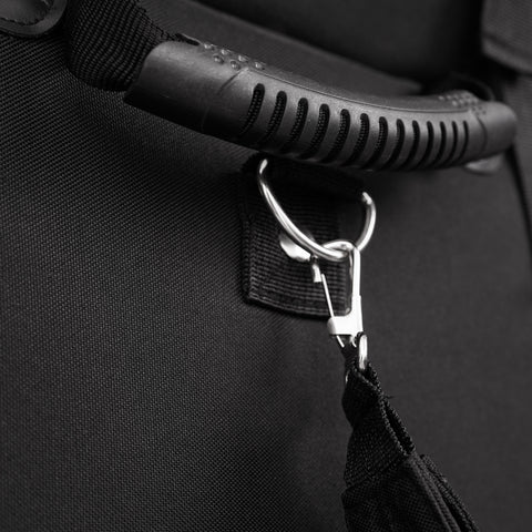 Main bag carry handle, backpack straps, and shoulder straps included for easy carrying off bike.