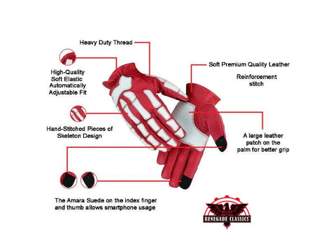 Renegade Classics's Red and Black Riding Glove with a skeleton design adds an edgy touch to your look. Crafted with care, these gloves feature bone-like patterns that stand out against any outfit. Beyond their bold appearance, these gloves offer functionality with a comfortable fit and flexible construction, making them suitable for activities like, driving, motorcycling or costume parties. Whether you're planning for a gothic vibe or looking to make a statement, these gloves are versatile accessories that add a dose of personality to your style. This pair of gloves comes with the following features: