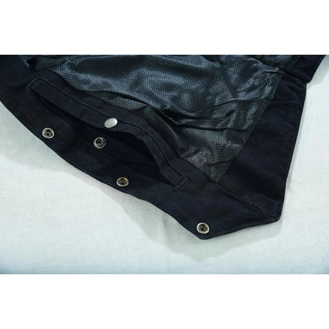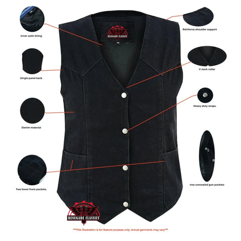 Why choose clothing from Renegade Classics for your next ride? We offer lots of perks, including free shipping on qualifying orders and a simple exchange policy. Place your order for our women's black denim sides motorcycle vest today.