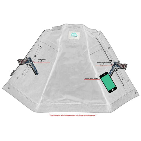 This vest is made from denim and includes plain sides and two lower front pockets. It also has two concealed Smart Access Pocket, which are made from heavy-duty textile. Built-in holsters and a snap closure will keep your gun secure, while reinforced shoulder support will keep you comfortable. No one will realize you're wearing a Safety Tool, and you can reach for it easily whenever you need access.