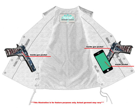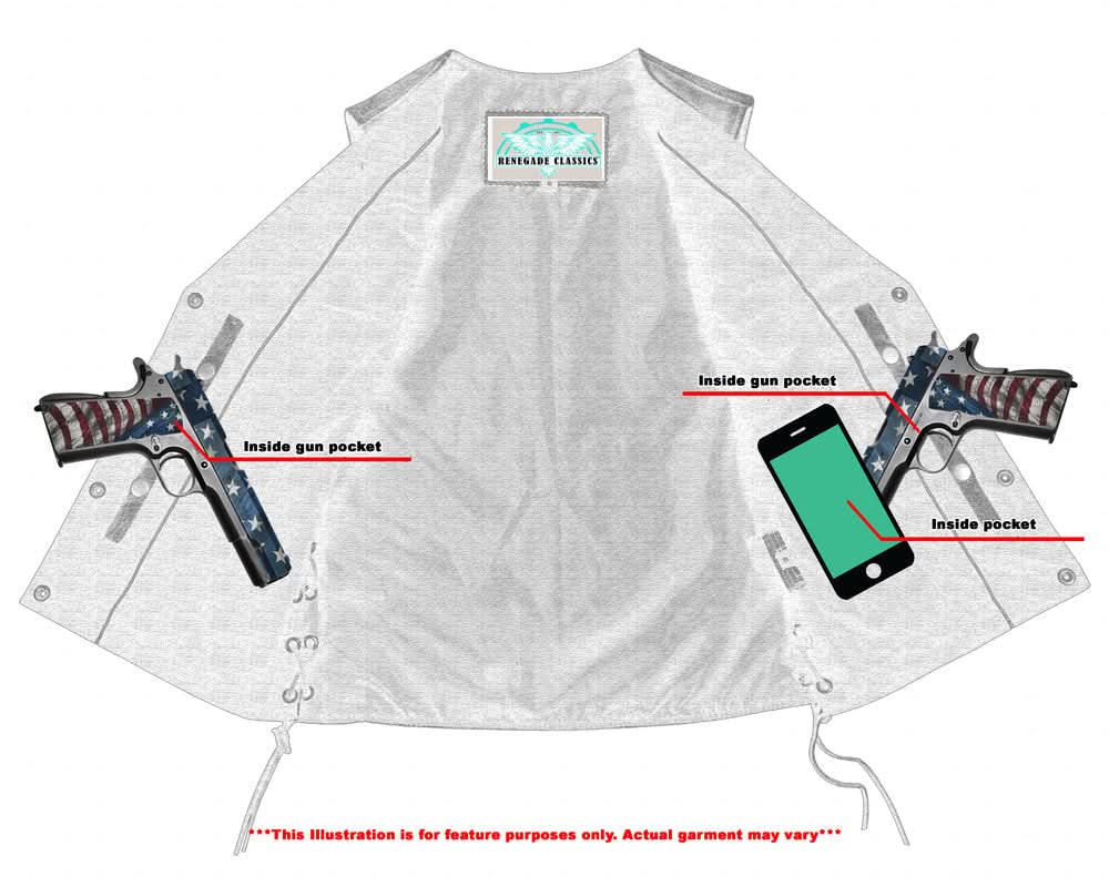 2 inside concealed gun pockets made of special heavy-duty textile with built-in holsters and snap closure.