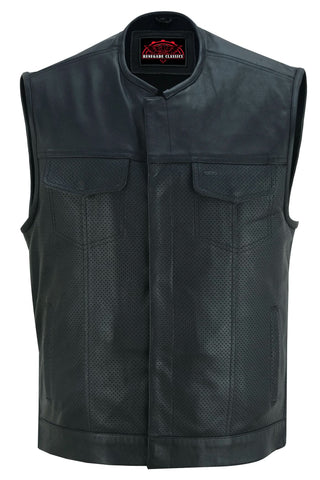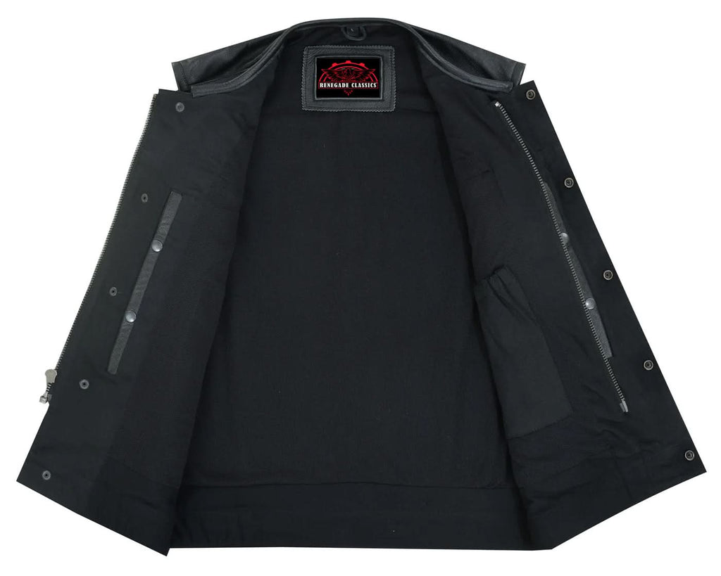 If you're looking for a men's single back panel concealment vest without a collar, Renegade Classics Inc. has you covered. Our collarless, perforated vest is made from soft, premium drum-dyed cowhide for comfort and durability. The single-panel back is customizable with patches or airbrushed artwork.