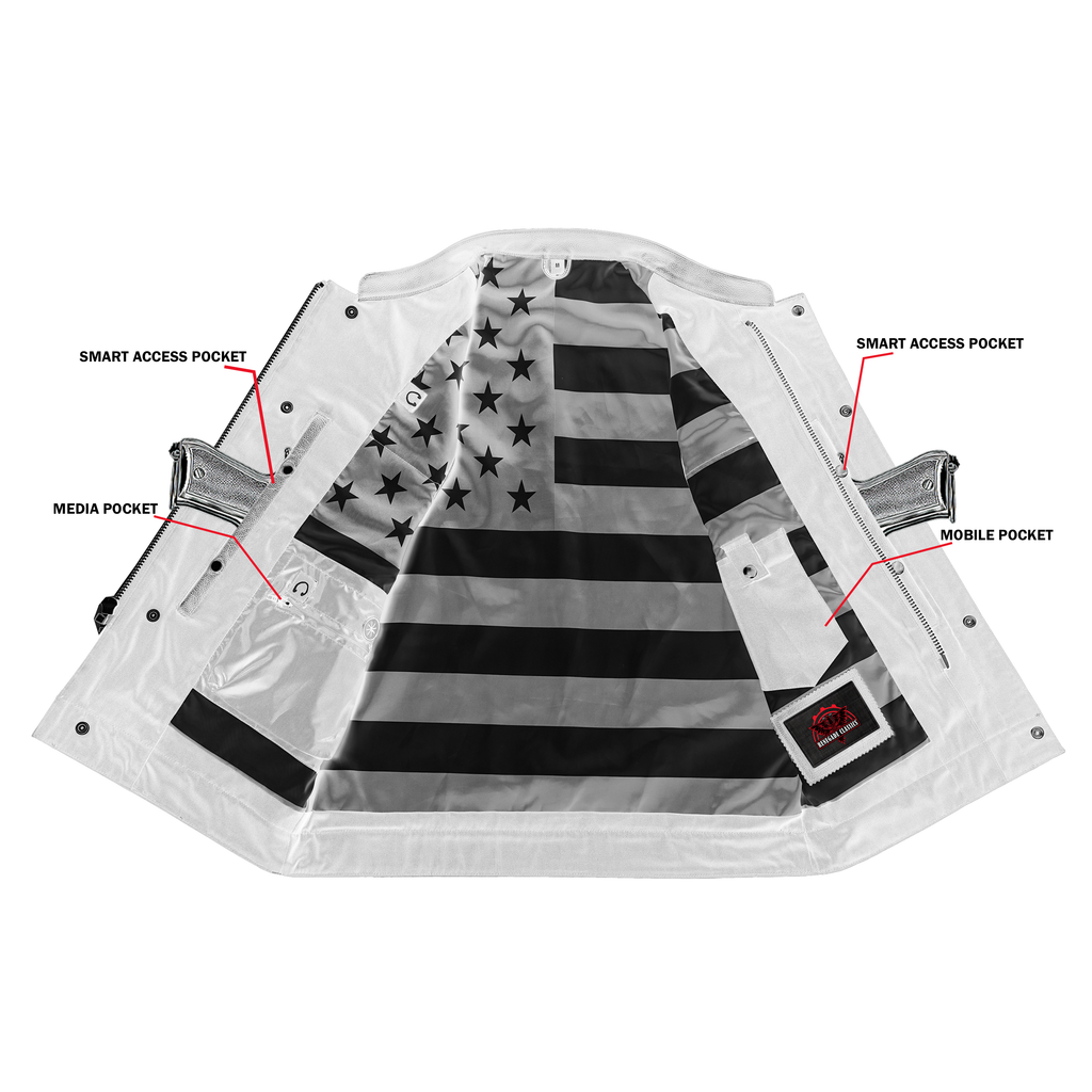 2 upgraded style concealed gun pockets between the snap and the zipper made of special heavy-duty textile with built-in holsters and snap closure.