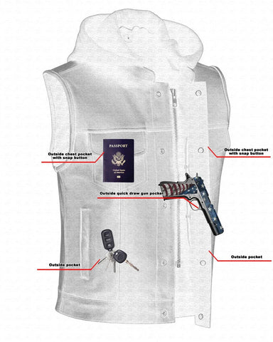 For concealed carry, this style contains two pockets located between the snaps and hidden zipper. The vest comes equipped with holsters and snaps closures for secure storage and quick access.