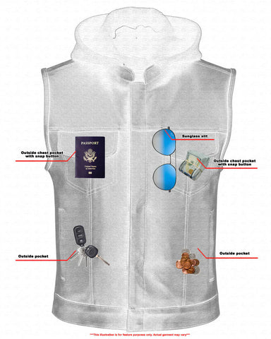 Vests are designed to keep you comfortable in all seasons, whether you're layering with a leather jacket or wearing it alone. Our men's single panel concealment motorcycle vest with a removable hood is ideal for all weather.