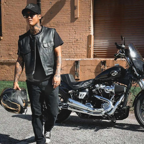 The Men's Short Club Vest. Made from cowhide leather, it includes four exterior pockets, one Quick Access concealed carry pocket, One inside conceal carry pocket, a zip snap main closure, YKK hardware, and a one-panel back, offering both style and functionality for various settings.