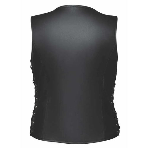 The Ladies PREMIUM vest in soft lightweight leather by Unik Lightweight Premium combines soft goatskin leather construction, a flattering fit, functional features such as two exterior zippered pockets and two interior concealed carry pockets, side laces for adjustment, silver hardware, and a snap front main closure. Available in sizes XS to 5XL, this vest offers comfort, style, and practicality for various occasions.