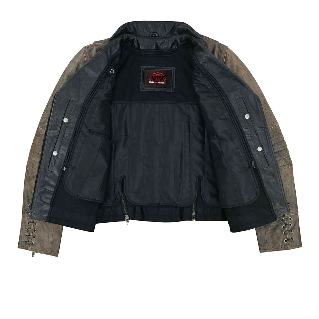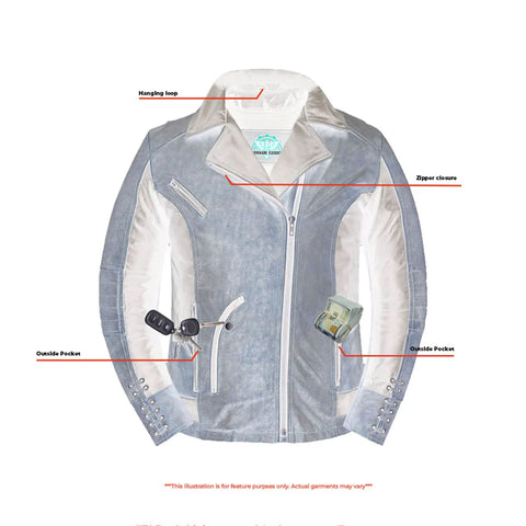 The Fusion Flow Women's Leather Jacket is made of soft superior drum dyed supple cowhide 1.1-1.2 mm. It features stylish grommet and the detailing of lacing accents and a snap-down lapel and collar add to the charm. A vented zipper chest pocket and two back vents promote airflow, allowing you to breathe comfortably regardless of the season.