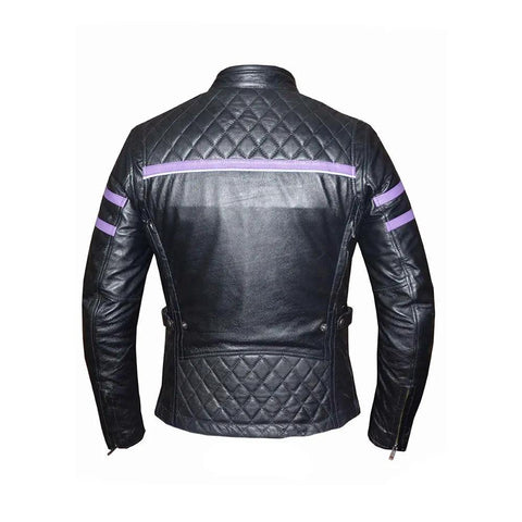 Elevate your style with the Style # 6560.17 Ladies Purple Striped Leather Jacket from Unik Ultra. Crafted from cowhide leather in a striking black and purple color combination, this jacket combines bold design with practical features, making it a standout piece in any wardrobe. Make a bold fashion statement designed to enhance your wardrobe with its distinctive design and functional features suitable for both casual and semi-formal occasions.