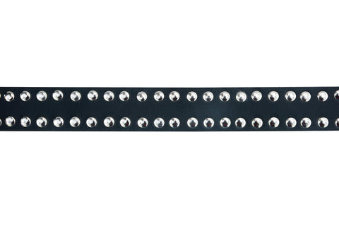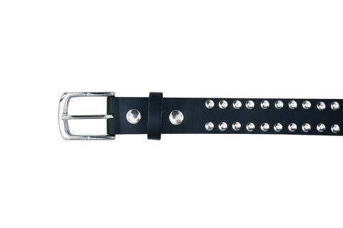 Create a fashion statement with our silver studded leather belt! Crafted from black leather, and embossed with metal studs, this unique design ensures both fashion and comfort. Enhance any bottom with this timeless accessory.