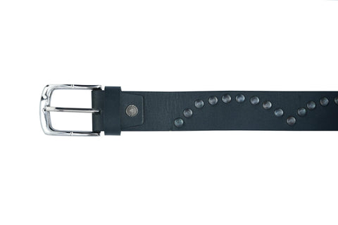 Enhance your style with our Black curved pattern studs belt, crafted from genuine premium leather for lasting durability. The adjustable fit, sleek chrome-plated buckle, and studs make it a versatile and distinctive addition to your wardrobe, ensuring comfort and a polished look.