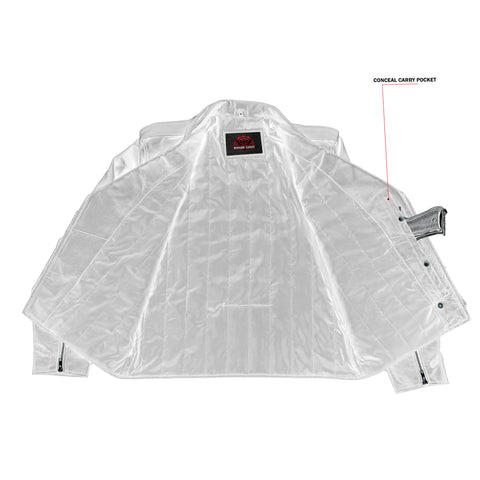 - 1 inside left-hand side concealed gun pocket made of special heavy-duty textile with built-in holsters and snap closure and 1 regular inside pocket.