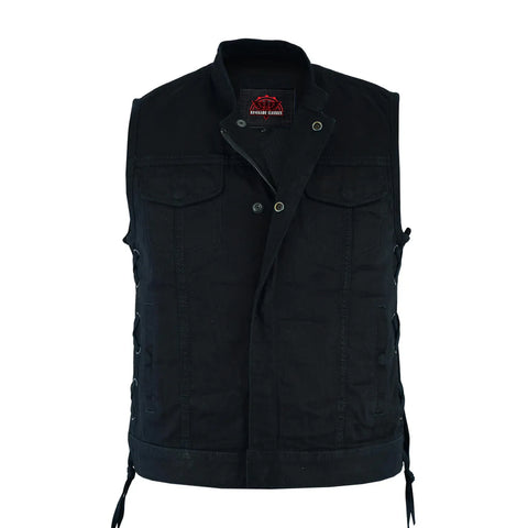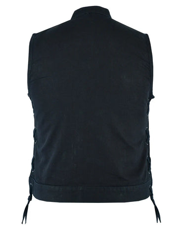 This vest features an inside cellphone pocket and a front zipper hidden beneath a snap-placket that blocks rain and wind. With all-black construction, it has side laces for a stylish look and easy size adjustment. The single-panel back can showcase logos and club patches as well as embroidery.