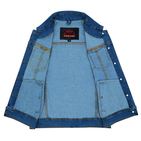 Our products come with lifetime warranties. We offer a simple exchange and return policy, too. Buy your women's blue denim snap front biker vest today.