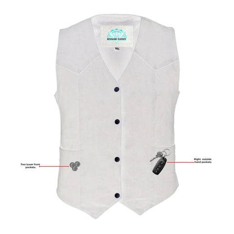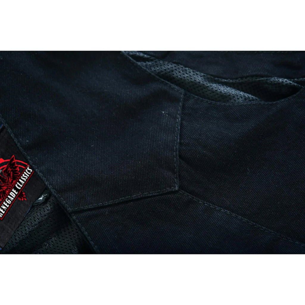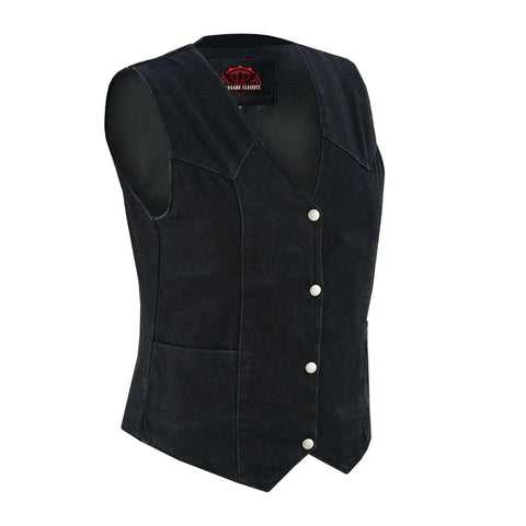 Why choose clothing from Renegade Classics for your next ride? We offer lots of perks, including free shipping on qualifying orders and a simple exchange policy. Place your order for our women's black denim sides motorcycle vest today.