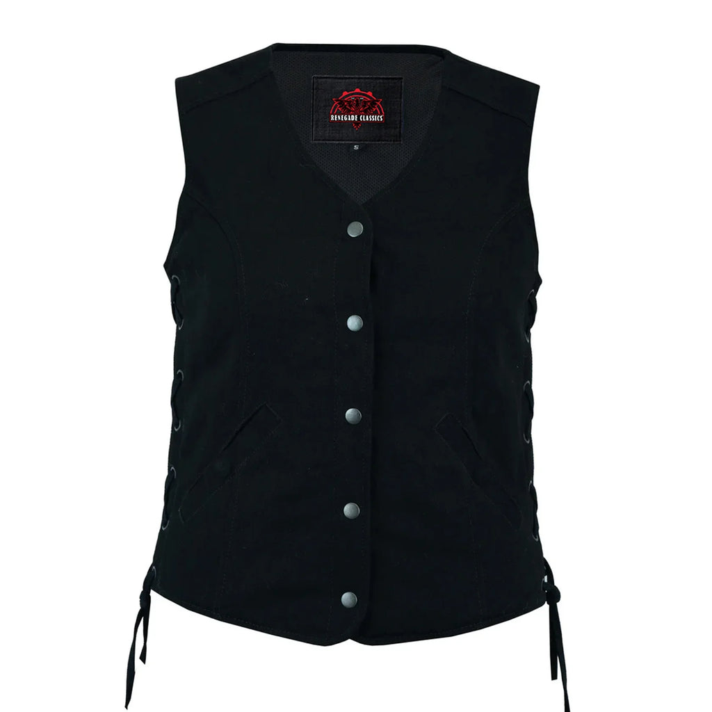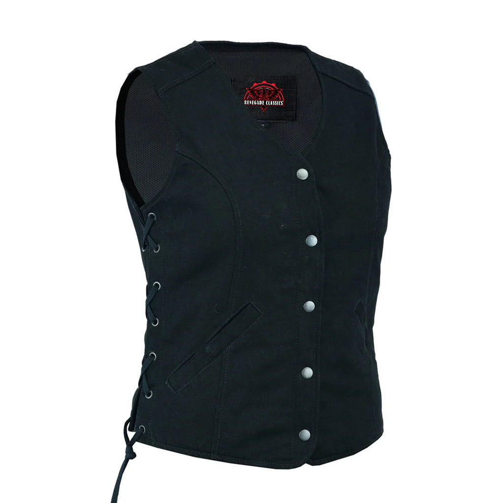 When you buy a vest to wear while you bike, you want it to offer the right amount of protection -- but not at the expense of style. This women's longer-body 3/4 denim biker vest checks all the boxes. It includes an open neck and side laces as well as a single back panel, which you can accessorize with patches, club logos or embroidery.