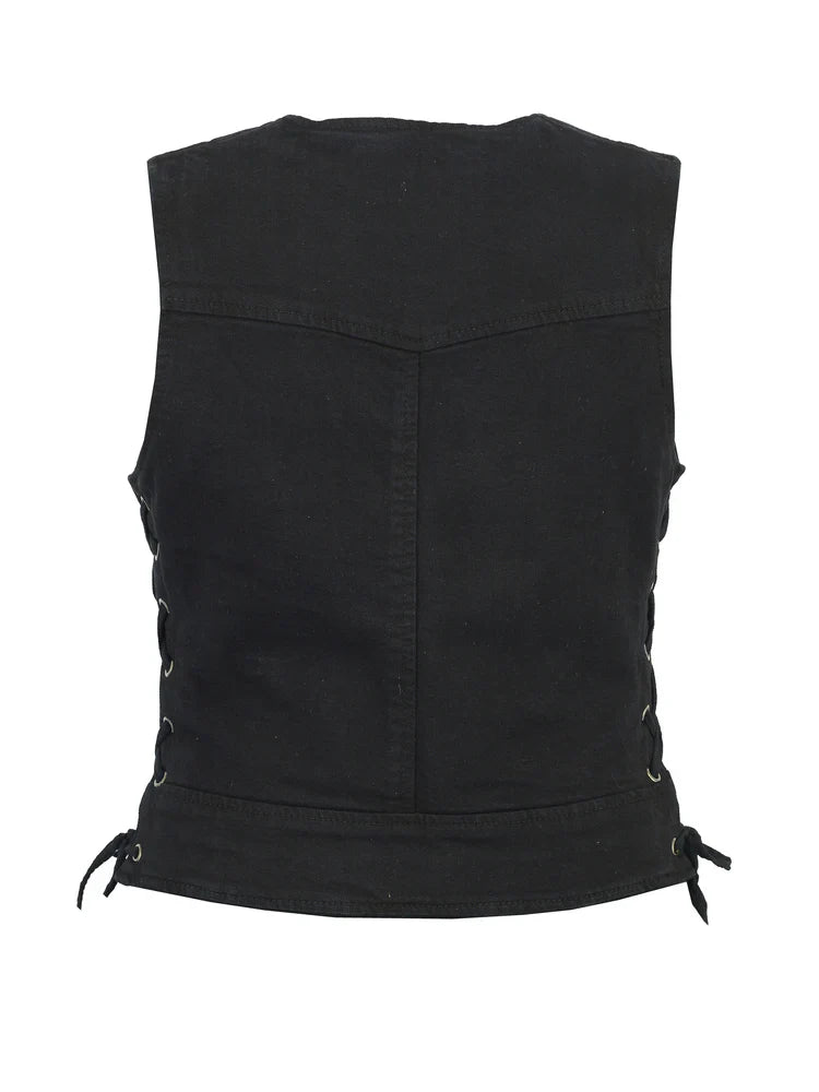 The best biker clothing is attractive and durable. Our women's black denim biker vest can accompany you on ride after ride and maintain its shape and fit. It's made in a short, fitted style that will accentuate your form while you ride. The side-laced vest provides the perfect fit and flexibility.