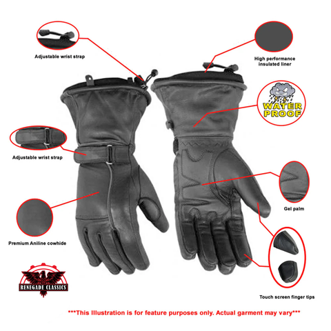 Women's waterproof gauntlet glove featuring high performance insulated liner for extra warmth, reflective piping, gel palm, an adjustable wrist strap. Made in premium Aniline cowhide.