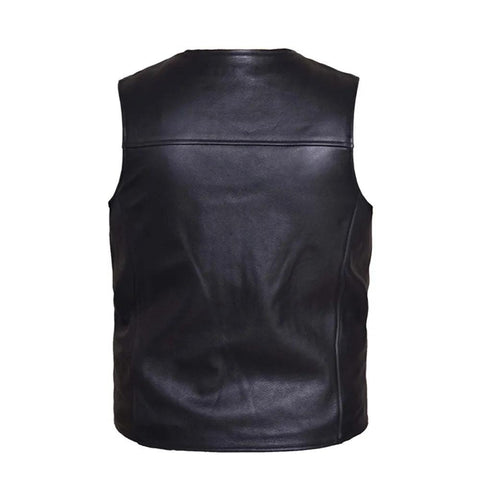 The Men's Premium Leather Vest by Unik Premium blends classic elegance with practical features. Made from cowhide leather, it includes two zippered exterior pockets, two concealed carry pockets, Buffalo Nickel snaps, silver hardware, side zips for adjustability, and a sleek black color, ensuring versatility and style for various settings.